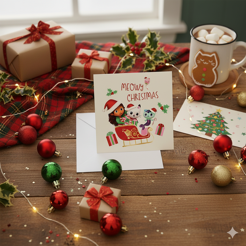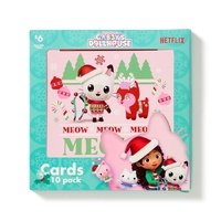Celebrate the season with a burst of playful holiday cheer in Gabby's Dollhouse Christmas Cards 10 Pack. These square cards feature cartoon cat and girl characters, festive illustrations including gifts, trees, and snowy delights, plus the witty text 'MEOWY CHRISTMAS'. Pair them with handwritten notes or your favourite seasonal decor for a jolly card exchange.